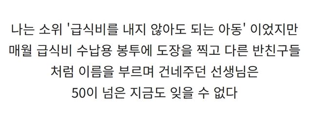 당시 학교에서는 매월 급식비를 수납한 후 봉투에 도장을 찍어 학생들에게 다시 돌려주곤 했습니다. A씨는 돈을 낸 적이 없었지만, 담임선생님은 매월 A씨의 급식비 수납용 봉투에도 어김없이 도장을 찍어주었습니다. 그리고 다른 반 친구들과 똑같이 이름을 부르며 봉투를 건네주었습니다.
