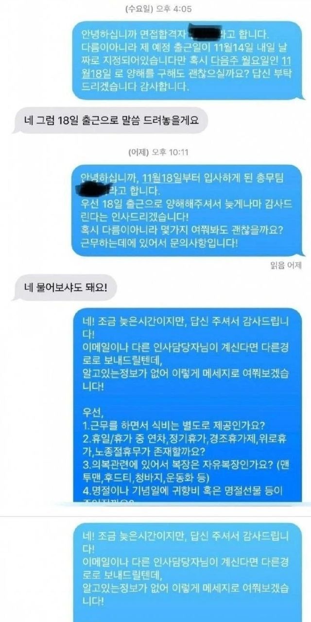 공개된 대화 내용에 따르면, 면접 합격자 A씨는 당초 11월 14일이었던 출근일을 다음 주 월요일인 18일로 연기해달라는 양해를 구하며 대화를 시작했습니다. 담당자가 이를 수락하자, A씨는 입사 이틀 전인 일요일 밤 10시가 넘은 시각에 다시 메시지를 보냈습니다.