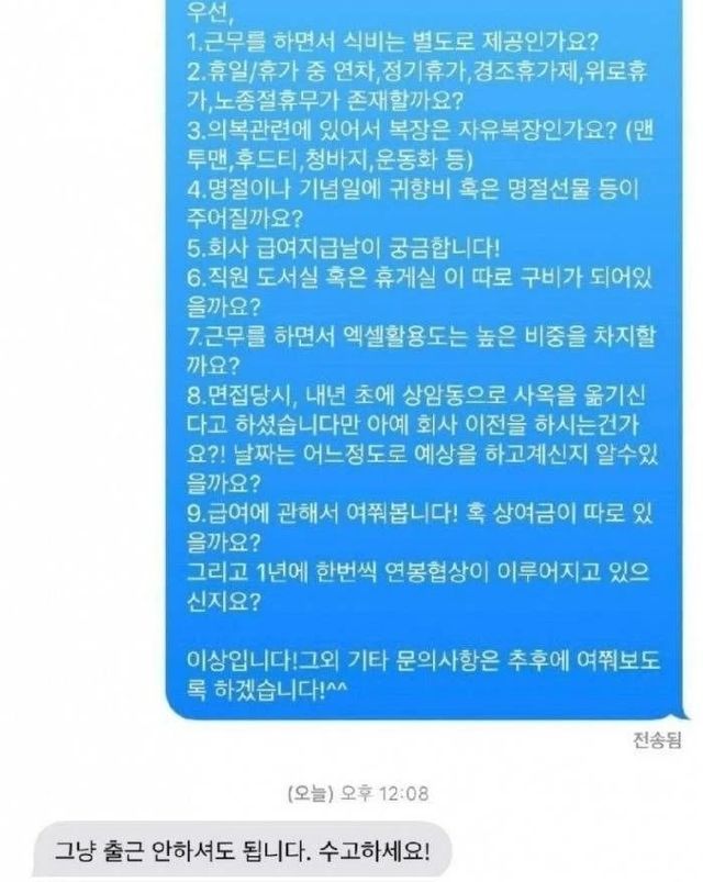 A씨는 "근무하는 데 있어 몇 가지 문의 사항이 있다"며 무려 9가지의 구체적인 질문을 쏟아냈습니다. 질문 리스트에는 식비 별도 제공 여부, 연차 및 노조절 휴무 존재 여부, 자유 복장 가능 여부(맨투맨, 청바지 등), 명절 귀향비 및 선물 지급 여부, 급여일 및 상여금 유무, 엑셀 활용 비중, 사옥 이전 날짜 등이 포함되었습니다.