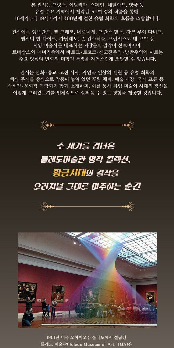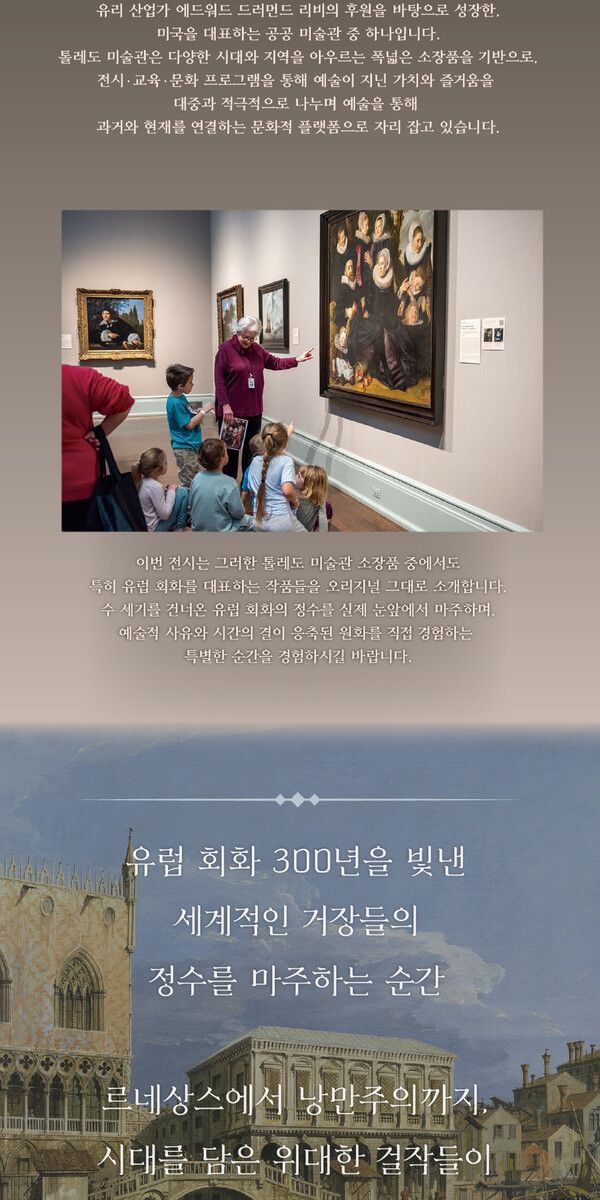 이번 전시는 미국 오하이오주에 위치한 톨레도 미술관(Toledo Museum of Art)의 방대한 소장품 중 서양 미술사를 상징하는 거장들의 작품만을 엄선하여 선보이는 자리다.