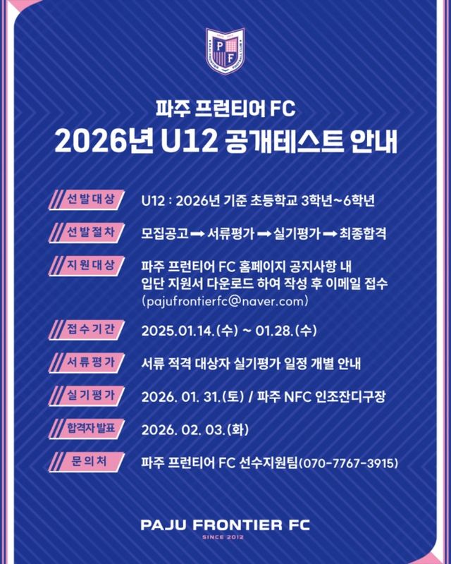 지원 대상은 2026년 기준 초등학교 3학년~6학년이며 참가를 원하는 선수는 파주 프런티어 FC 공식 홈페이지 공지 사항에서 입단 지원서를 다운로드하여 작성한 후 오는 1월 28일(수)까지 이메일(pajufrontierfc@naver.com)로 접수하면 된다. 서류 적격 대상자에게는 실기평가 일정이 개별 안내될 예정이다.