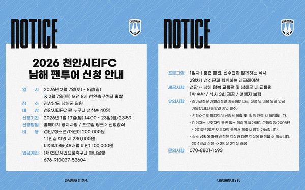 19일 천안이 "천안시티FC 2026 남해 팬투어는 2월 7일부터 8일까지 주말 이틀간 경상남도 남해군 창선면 일원에서 진행된다"라고 밝혔다.