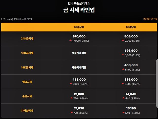국내 금시세(금값)가 19일(한국 시각) 오후 상승세(전 거래일 대비)로 마감했다.