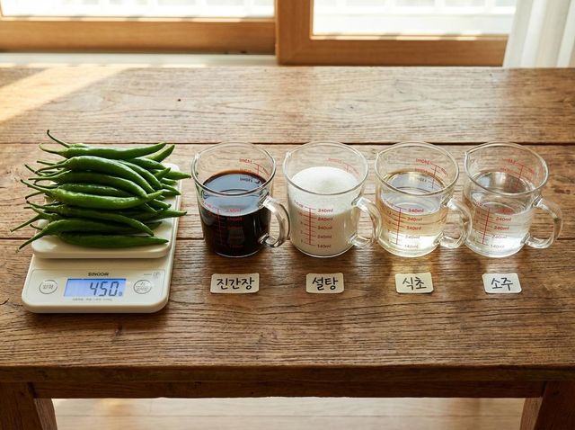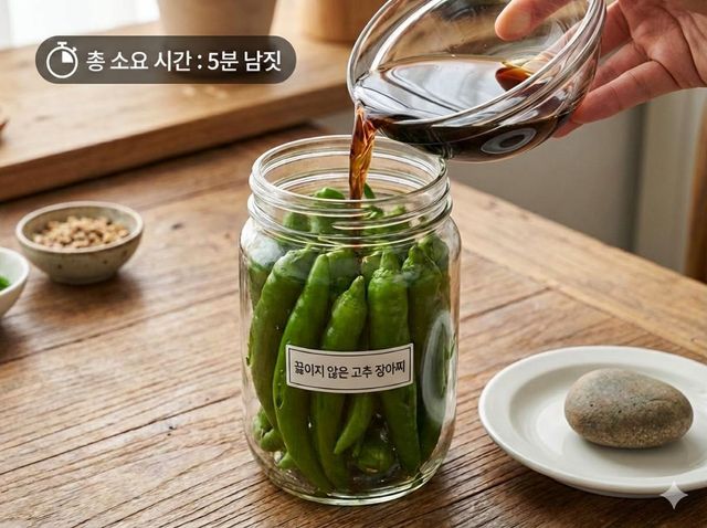 재료 구성은 단순하다. 고추 400~500g을 준비해 깨끗이 씻은 뒤 물기를 완전히 제거한다. 절임장은 진간장 1컵, 설탕 1컵, 식초 1컵, 소주 1컵이다. 물은 넣지 않는다. 이 비율이 유지돼야 끓이지 않아도 잡균 번식 가능성을 낮출 수 있다.