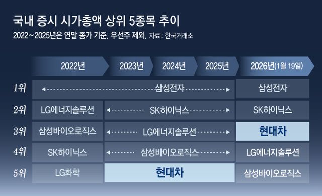 현대차는 올해 들어 주가가 61.9%나 상승하며 시총 3위에 올라섰다. 2022년 이후 삼성전자, SK하이닉스, LG에너지솔루션, 삼성바이오로직스 등으로 공고화된 4강 구도가 깨졌다.