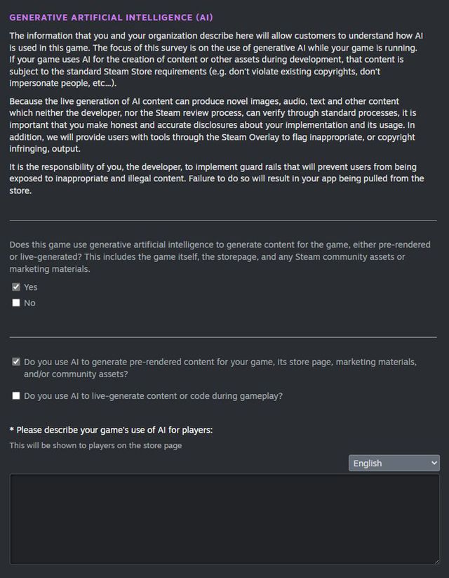 AI 사용 여부를 알려야 하는 부분은 유저가 직접 소비하는 콘텐츠를 AI로 생성했을 경우에 한정한다. 아트워크, 사운드, 내러티브, 번역 등 게임 구성 요소와 스팀 상점 페이지, 스팀 커뮤니티 애셋, 마케팅 자료 등이 이에 포함된다. 또한 게임 플레이 중 콘텐츠나 코드를 생성하기 위해 AI가 사용되는 경우(NPC 활동이나 대사 등)에도 표시해야 한다.