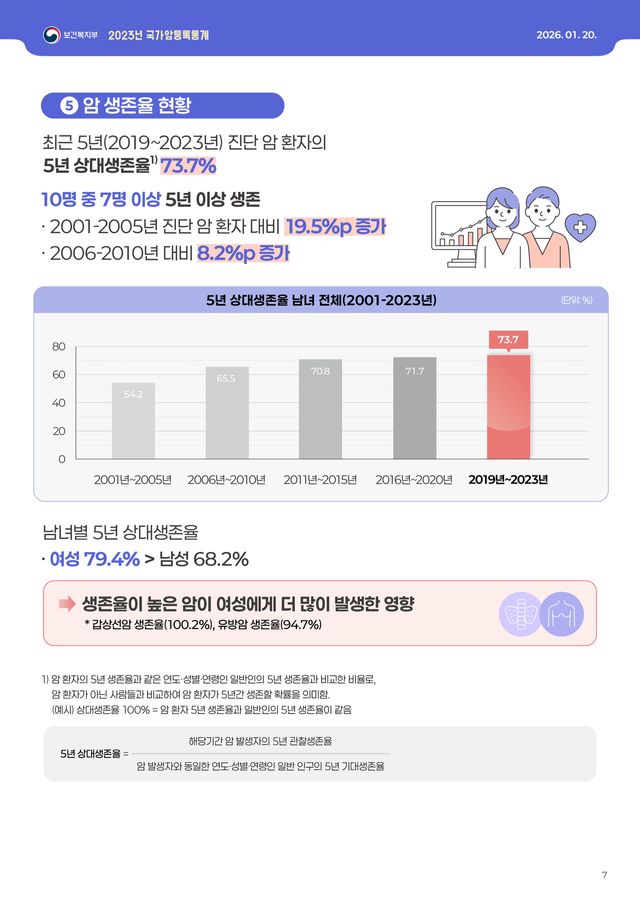 보건복지부와 중앙암등록본부(국립암센터)는 20일 발표한 ‘2023년 국가암등록통계’에서 2019~2023년 사이 암을 진단받은 환자의 5년상대생존율이 73.7%에 달했다고 밝혔다. 이는 2001~2005년 진단군의 5년 생존율(54.2%)보다 19.5%포인트 높아진 수치로, 지난 20여 년간 국내 암 치료 성과가 꾸준히 개선돼 왔음을 시사한다.