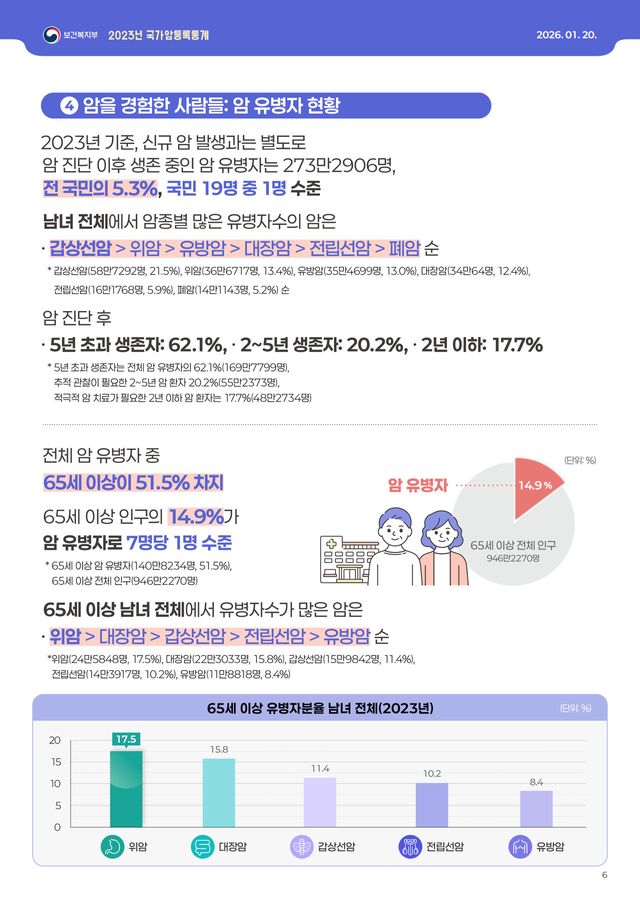 치료 중이거나 완치 판정을 받은 암 경험자는 273만2906명으로, 국민 19명당 1명꼴이다. 암 경험자가 빠르게 늘어나면서 치료 이후의 삶의 질, 재발 관리, 직장·사회 복귀 지원 등 ‘암 이후 삶’을 포함한 정책적 대응이 중요한 과제로 떠오르고 있다.