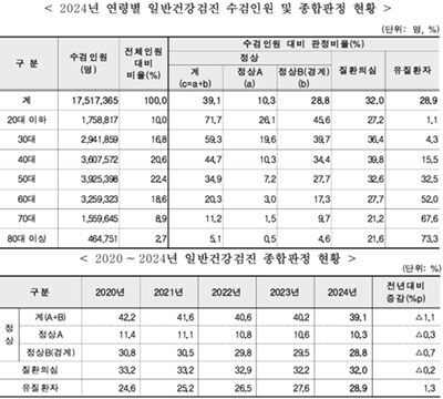 2024년 일반건강검진 수검자 1,751만 7,365명 중 정상 판정을 받은 비율은 39.1%로 전년 대비 1.1%포인트 감소했다.