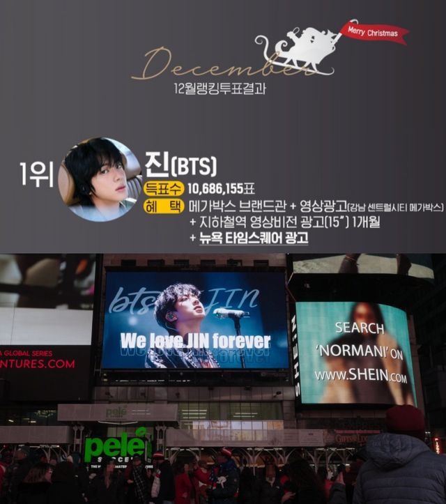글로벌 팬덤 플랫폼 덕애드(DUCKAD) 12월 월간 인기투표에서 방탄소년단(BTS) 진이 10686155표를 얻어 1위에 올랐다. 한 달간의 투표 결과는 곧바로 세계적인 랜드마크로 이어졌다. 1위 리워드로 1월 17일 뉴욕 타임스퀘어 대형 전광판에 진의 광고 영상이 송출됐다. 해당 영상은 팬들이 직접 디자인 제작에 참여해 완성한 콘텐츠로, 투표 결과 이상의 의미를 남겼다.