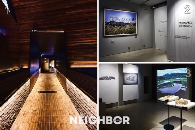 그래서인지 전시실에 들어가는 입구 바닥에 쓰인 ‘Be Gentle with the Earth’를 지나는 순간부터 전시가 시작되는 기분이었습니다. 대지를 대하는 마음이 담긴 건축의 시작점이랄까요. 그럴 수도 있죠. 건축주가 중시한 지점이기도 하고, 이 건축에 담긴 저의 철학이기도 하니까요.