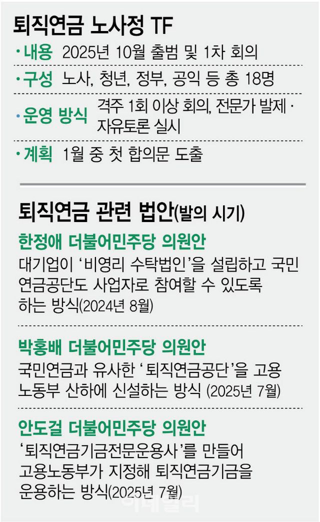 퇴직연금을 운용할 ‘별도 기관’을 어떻게 구성할지에 대해선 대표적으로 3가지 법안이 제출된 상태다. △대기업이 ‘비영리 수탁법인’을 설립하고 국민연금공단도 사업자로 참여할 수 있도록 하는 방식(한정애 의원안) △국민연금과 유사한 ‘퇴직연금공단’을 고용노동부 산하에 신설하는 방식(박홍배 의원안) △‘퇴직연금기금전문운용사’를 만들어 고용노동부가 지정해 퇴직연금기금을 운용하는 방식(안도걸 의원안) 등이다. TF는 이달 내 합의문에서 기본적인 틀을 마련하고, 추후 경제사회노동위원회(경사노위) 등에서 운용 주체를 비롯한 세부 방식을 논의한다는 계획이다.
