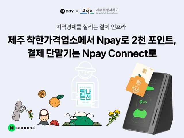 제주도는 올해 착한가격업소에 네이버페이 커넥트 단말기 설치를 지원한다. 이 단말기를 통해 현금, 카드, 큐알(QR), 모바일 간편 결제 등이 가능하다. 특히 '탐나는전' 체크카드를 네이버페이에 등록하면 모바일 결제를 할 수 있다.