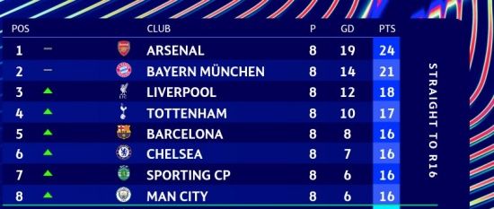 16강에 직행한 팀은 아스널(잉글랜드)을 비롯해 바이에른 뮌헨(독일), 리버풀, 토트넘 홋스퍼(이상 잉글랜드), 바르셀로나(스페인), 첼시(잉글랜드), 스포르팅(포르투갈), 그리고 맨체스터 시티(잉글랜드)다.