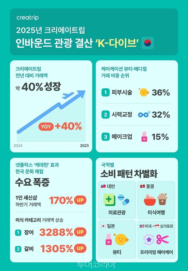 2025년 크리에이트립의 전체 거래액은 전년 대비 약 40% 성장했다. 성장을 견인한 주역은 단연 뷰티·메디컬. 이 두 카테고리는 전체 거래액의 51%를 차지하며 한국 관광의 무게중심이 ‘자기관리’로 이동했음을 보여준다.