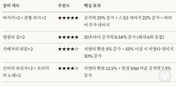장비의 경우 치명타 확률이 55% 이상일 때 회심 대미지를 30%나 올려주는 '지배자의 위압' 세트나 공격력을 극대화하는 '버서커', '영광의 길' 세팅이 베스트로 꼽히며, 이는 초월 단계에서 얻는 치명타 강화 효과와 결합하여 상상을 초월하는 시너지를 낸다.