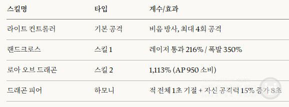 여기에 '랜드크로스'는 레이저 통과 시 216%, 폭발 시 350%의 대미지를 입히며 안정적인 지속 딜링을 보조한다. 특히 하모니 스킬인 '드래곤 피어'는 적 전체를 1초간 기절시킴과 동시에 자신의 공격력을 15% 상승시켜 공수 양면에서 빈틈없는 구성을 보여준다.