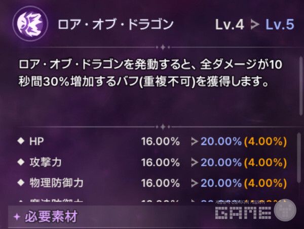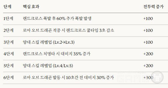 특히 로어 오브 드래곤은 기본적으로 공격력 1113%의 대미지를 부여하지만, 레벨 5단계에서는 스킬 대미지가 공격력의 1700%가 넘어간다. 이 5단계에서는 랜드크로스 쿨타임이 3초 감소하고, 모든 대미지 증가 버프가 30% 증가하고 지속 시간도 10초 늘어난다.