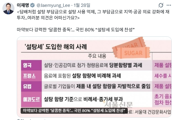 논란의 시작은 전날 오전 이 대통령의 소셜미디어 글에서부터 시작됐다. 이 대통령은 엑스(X, 옛 트위터)에 <마약보다 강력한 '달콤한 중독'… 국민 80% "설탕세 도입에 찬성">이라는 제목의 한 언론사 기사를 공유하며 "담배처럼 설탕 부담금으로 설탕 사용 억제, 그 부담금으로 지역·공공 의료 강화에 재투자… 여러분 의견은 어떠신가요?"라고 적었다. 첨부된 기사 이미지에는 "'설탕세' 도입한 해외 사례"라는 글귀도 쓰여 있었다.