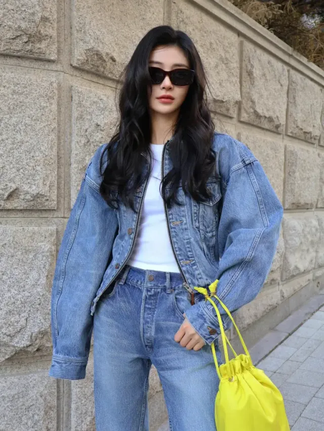 가장 먼저 시선을 압도하는 건 오버사이즈 데님 재킷의 실루엣이다. 어깨선이 툭 떨어지는 드롭 숄더와 소매의 풍성한 볼륨감은 체구를 오히려 가녀리게 보이게 만드는 마법을 부린다. 여기에 이너로 군더더기 없는 화이트 크롭 티셔츠를 매치해 허리 라인을 슬쩍 드러냄으로써, 자칫 벙벙해 보일 수 있는 '데님 지옥'에서 깔끔하게 탈출했다.