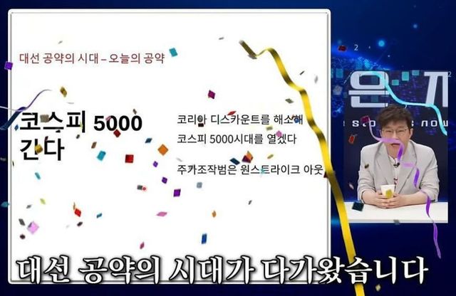 앞서 슈카월드는 과거 이재명 대통령의 '코스피 5000' 대선 공약에 대해 언급했고, "코리아 디스카운트를 해소해 5000 시대를 열겠다? 국가 조작 부분 원스트라이크 아웃, 여기에 상법 개정도 하고 이런 거 저런 거 좋은 거 다 해서 5000! 공약이니까~ 자 3000, 4000 아니고 자 5000입니다. (앞으로) 얼마나 올라야 되냐면 딱 100%만 오르면 된다. 대선 테마주 '코스피'"라며 비꼬는 듯한 뉘앙스의 발언을 했다.