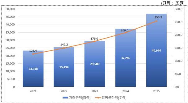 통화별로는 원화 거래가 231조 5500억원(87.15%)으로 대부분을 차지했고, 외화 거래는 34조 1400억원(원화환산 기준·12.85%)이었다.