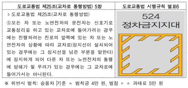 단속 대상은 교차로에 설치된 '정차금지지대'에서 발생하는 위반 행위다. 정차금지지대는 교차로 네 모퉁이를 연결하는 빗금친 사각형 구역으로, 어떤 경우에도 차량이 정차할 수 없는 곳이다.