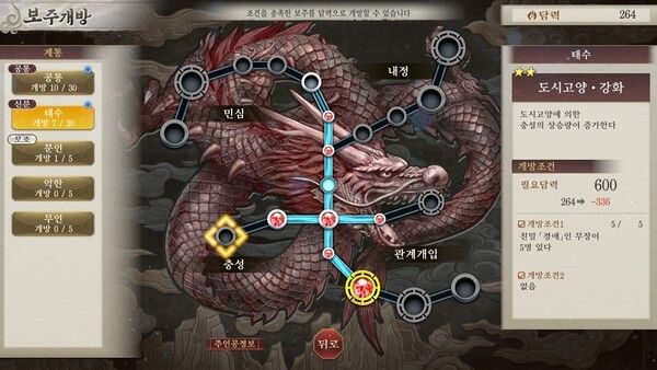 보주 시스템은 일종의 특성 시스템으로 게임상에 필요한 여러 기능들을 확장해 발전시킬 수 있다. 신분에 따라 다양한 퍽이 발생하는데, 재야에서는 행동력을 올려주는 퍽이 나오는 식이다. 태수로 올라서면 지역 충성도를 오르게 하거나 내정도를 올리는 등 여러 특성을 찍어서 게임상에 활용할 수 있다. 이로 인해 유저가 선택하는 트리에 따라 특정 행동을 아예 취하지 않더라도 게임상에서 자동으로 보존되는 경우가 있다. 일례로 민심 탭을 찍으면 가만히 있어도 알아서 민심이 오르기 때문에 탐문을 할 필요가 줄어드는 식이다. 또, 충성도 탭을 올리면 계절마다 충성도가 올라 배신을 걱정하지 않아도 되기도 한다. 또, 교류를 보다 편하게 해주는 시스템을 활용해 일종의 세력을 구성하기도 쉬워졌으며, 그 외 다양한 보조 기능들이 동작해 유저들의 전략적 활용도에 여유가 생겼다.