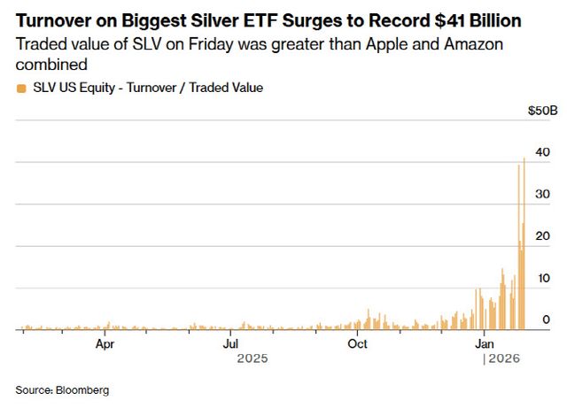 최대 은 상장지수펀드(ETF)인 아이셰어스 실버 트러스트(SLV)는 지난달 30일 400억달러(약 58조원) 이상의 거래량을 기록했다. 몇 달 전만 해도 20억달러(약 2조9000억원) 이상 거래되는 것이 드물었던 것이 어느새 지구상에서 가장 많이 거래되는 증권 중 하나가 됐다.