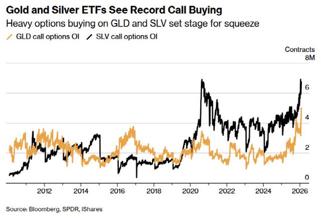 개인 투자자들 사이에서 인기를 끌고 있는 옵션 거래도 열광적이었다. 레딧 커뮤니티에는 은 급등에 베팅해 1000% 이상 수익을 낸 사례가 공유됐다. SLV의 콜옵션 거래량은 나스닥100 지수를 추적하는 주요 ETF의 거래량을 넘어섰다.