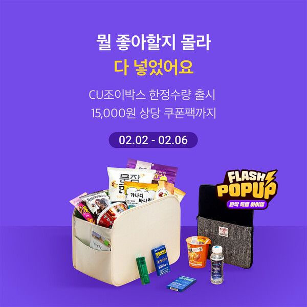 2월 1주차 플래시 팝업스토어 상품으로는 'CU조이박스 26년 설날 에디션'을 선보인다. 이 상품은 지난해 CU의 인기 차별화 상품 15개 품목을 세트로 구성했으며, 건강기능식품, 뷰티, 스낵류, 노트북 파우치, 다용도 수납 백 등이 포함됐다. 총 300개 한정 수량으로 판매한다. 포켓CU에서 사용할 수 있는 1만 5천원 상당 쿠폰 팩도 동봉된다.