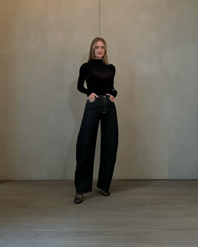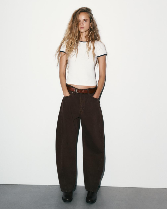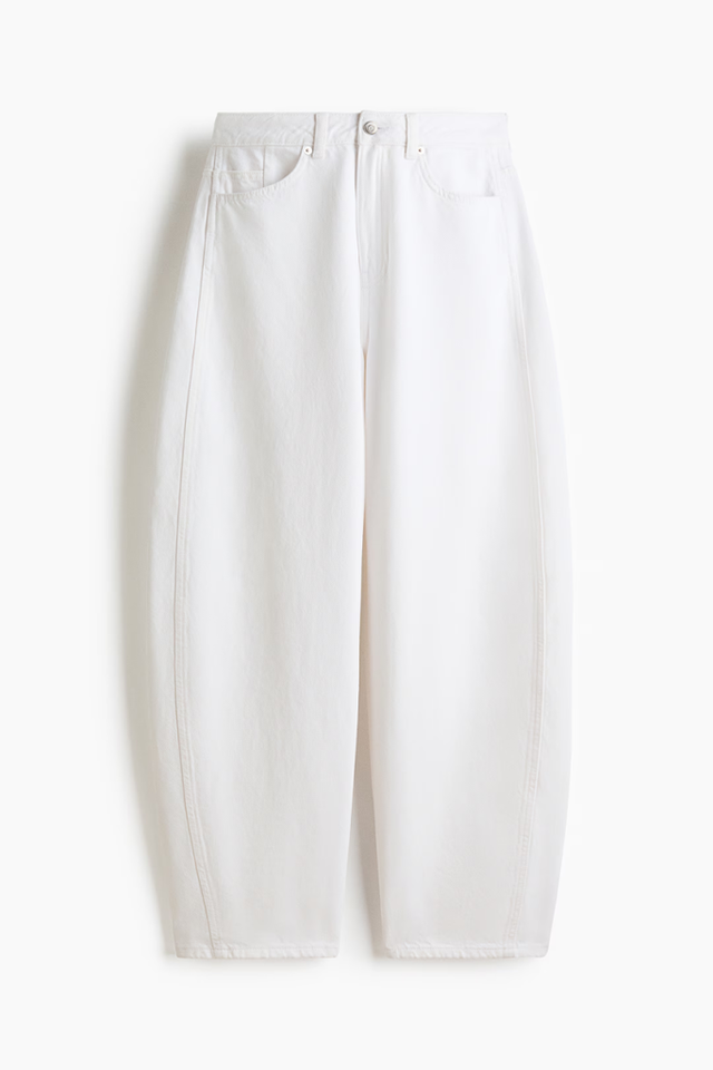 골반에 걸쳐 떨어지는 미드라이즈 배럴진은 발목 부분에 자연스러운 주름을 만들어 미니멀 스타일링에 제격인 아이템.
