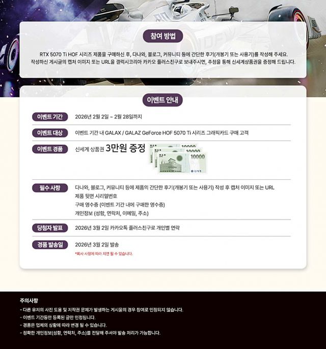 갤럭시코리아는 2월 한 달간 GeForce RTX 5070 Ti HOF 시리즈 구매 고객을 대상으로 후기 이벤트를 진행한다. 제품 개봉기 또는 사용기를 다나와·블로그·커뮤니티에 올린 뒤, 게시글 URL 또는 캡처 이미지와 영수증, 제품 시리얼 번호, 개인정보를 카카오톡 플러스친구 채널로 제출하면 응모된다. 추첨으로 신세계 상품권을 증정한다.
