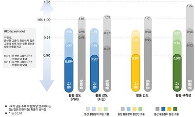 특히 활동의 거리, 시간, 빈도, 규칙성 등 모든 지표에서 정신질환 위험을 낮추는 경향이 일관되게 나타났다.