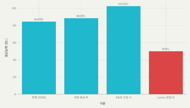 송도 공장의 총 생산능력은 78.5만ℓ에 이른다. 여기에 락빌 6만ℓ가 더해지면 84.5만ℓ로, 세계 2위인 론자(Lonza, 약 50만ℓ)를 압도적으로 앞선다. 만약 락빌 공장을 10만ℓ까지 증설한다면 총 88.5만ℓ, 여기에 송도 6공장(18만ℓ) 건설까지 완료되면 100만ℓ를 넘어선다. 캐파(생산능력)가 곧 수주력인 CDMO 업계에서 삼성바이오로직스는 사실상 독보적 존재가 된다.