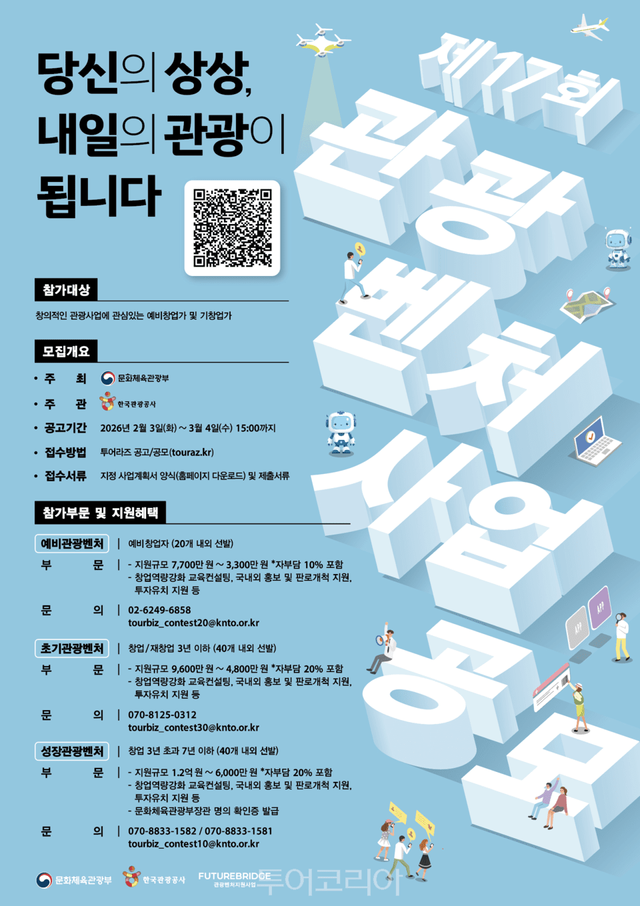 양 기관은 ‘제17회 관광벤처사업 공모전’을 2월 3일부터 3월 4일까지 개최하고, 총 100개 관광벤처기업을 선발·육성한다고 밝혔다.