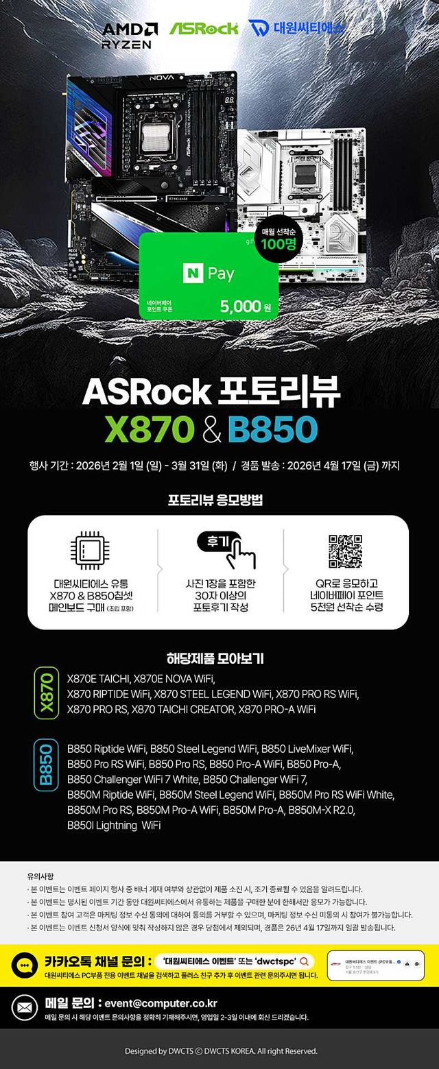 IT기기 수입·유통 전문기업 대원씨티에스가 ASRock X870 및 B850 칩셋 메인보드 구매 고객을 대상으로 네이버페이 포인트를 증정하는 포토리뷰 이벤트를 진행한다.