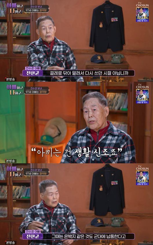 이어 아버지는 물건을 쉽게 버리지 못하는 이유를 언급하며 과거를 회상했다. 그는 "우리 시대에는 종이 한 장에 뭐가 묻어도 걸레로 닦아 말려 다시 쓰던 시절이었다"며 "아끼는 게 생활의 신조였다"고 설명했다.