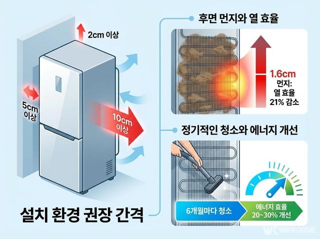 6개월에 한 번 정도 진공청소기나 부드러운 솔로 코일 먼지를 제거하는 것만으로도 에너지 효율이 20~30% 개선된다. 전기요금 절감뿐 아니라 냉장고 수명 관리에도 도움이 된다.