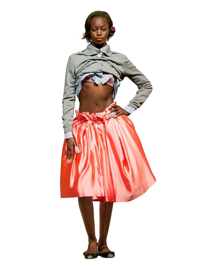 프라다 2026 S/S 런웨이에 무엇인가가 흩날리듯 등장했을 때, 관객의 반응은 거의 동시에 튀어나왔다. ‘도대체 저게 뭐지?’ 가슴 덮개였을까. 언더와이어인가, 밴드 없는 브라인가. 그 정체 모를 요소들은 설명하기 까다로운 느슨한 옷들과 함께 전면에 등장했다. 얇고 축 늘어진(혹은 서스펜더가 달린 것처럼 보이는), 서로 다른 소재를 조합한 랩 스커트, 버블 스커트 위에 레이어드한 튜닉 드레스, 과도하게 깊은 V넥 스웨터, 너무 주름져 금방이라도 흘러내릴 것처럼 보이는 오페라 글러브까지. 일각에서는 이처럼 비구조적인 옷들이 여성에게 필요한 지지와 형태를 외면한 것이 아니냐는 비판이 나왔다. 그러나 미우치아 프라다와 라프 시몬스는 언제나 패션이 주변 문화와 호흡하고 이를 반영하며 이에 응답하는 힘을 지녔다는 점에 주목해온 인물이다. 이번 컬렉션에서 구조의 부재는 의도된 것이었다. 이 옷들은 바로 그 모든 것을 내려놓는 데 관한 이야기였다. 최근 들어 점점 찾기 힘들어진 새로운 자극, 부담에서 벗어나 아무것에도 얽매이지 않은 상태에 가까워지려는 갈망 말이다.