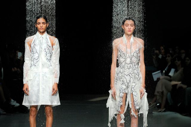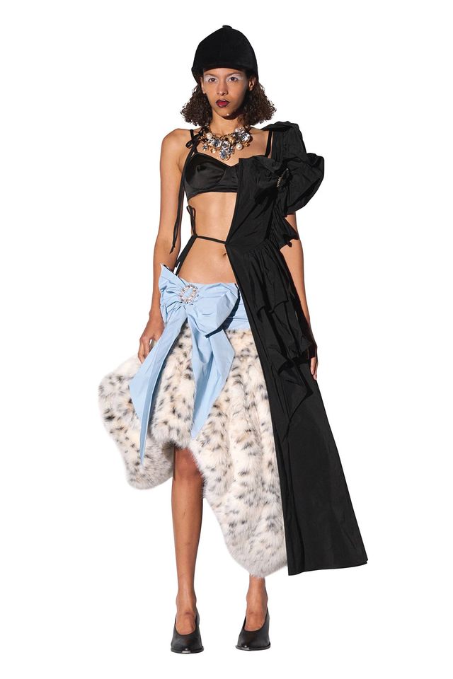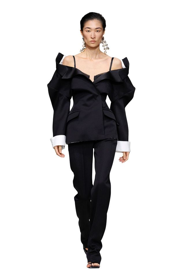 물론 패션에서 늘 그렇듯, 우리는 이미 이 지점을 지나온 적이 있다. 마틴 마르지엘라와 앤 드뮐미스터 같은 해체주의 디자이너들, 꼼데가르송의 레이 가와쿠보와 요지 야마모토로 대표되는 일본 아방가르드의 선구자들은 레이건 시대의 과잉에 대한 반작용으로 등장했다. 이들이 선보인 절제되고 분해된 디자인은 화려함과 요란함에 맞선 일종의 저항으로 받아들여졌고, 반짝임과 과시에 대한 매혹적 대안으로 자리했다. 존 갈리아노가 디올을 위해 선보였던, 드러냄과 벗김의 개념을 탐구한 디자인 역시 다시 주목받고 있다. 최근 킴 카다시안은 2000년 봄 시즌의 아이스 블루 컬러 프린세스 드레스를 입고 프리미어에 등장했다. 상체를 가로지르는 대각선 지퍼와 금방이라도 어깨에서 흘러내릴 듯한 소매는 모두의 시선을 사로잡을 레드 카펫 모먼트를 만들어낼 것처럼 보였다. 후세인 샬라얀은 2016년 봄 컬렉션에서 ‘풀어짐’을 보다 직설적으로 구현했다. 그는 물에 녹는 화이트 코트 두 벌을 선보였고, 모델들이 런웨이에 설치된 임시 샤워기 아래에 서자 코트가 서서히 녹아내렸다. 그 아래로 크리스털과 플로럴 아플리케로 장식한 흑백 가운이 드러났다.