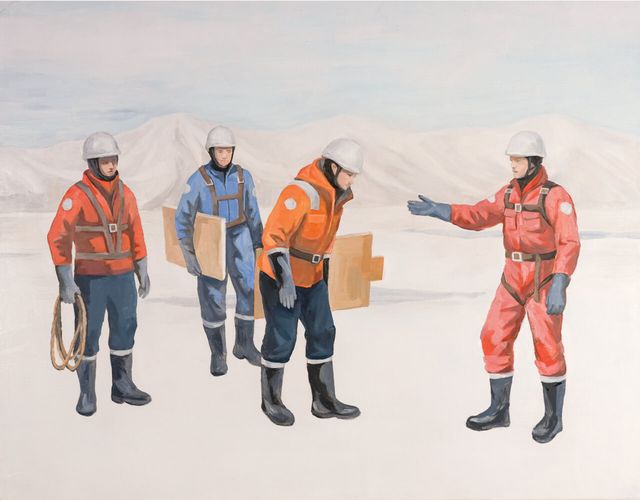 작가에게 ‘모험’은 과거 서구의 탐험 서사에서 비롯된 정복의 개념이 아닌 시야의 확장이며, 미지에 대한 두려움을 극복하는 과정이다. 7년간 바다를 항해한 케이틀린 스미스의 “모험 그 자체가 목적”이라는 대답에서 작가는 자신의 목적 지향적 관점을 되돌아보며 마침내 문명의 안락한 경계 밖인 북극으로 자신을 던졌다. 그러나 역설적이게도 그 거대한 자연 앞에서 작가가 목도한 것은 인간이 구축한 정교한 문명 시스템이었다. 전시의 출발점은 작가가 마주한 북극의 이질감이다. 기후 위기와 그린워싱의 상징으로 소비되어온 북극의 이미지는 실재하는 자연이라기보다 미디어에 의해 끊임없이 가공된 ‘기호’의 중첩에 가까웠다. 이러한 비현실적 감각은 신작 회화에서 극도로 절제된 ‘매뉴얼’ 형식으로 시각화된다. 작가는 생존을 위한 해상 훈련과 화재 진압 과정을, 마치 비상 상황까지 질서 속에 가둔 비행기의 ‘안전 매뉴얼’처럼 건조한 화면으로 옮긴다. 재난의 혼돈마저 인간의 질서와 체계 안에 있는 듯 연출된 이 장면은 대자연을 완벽하게 통제할 수 있다는 문명의 오만한 믿음을 투영한다.