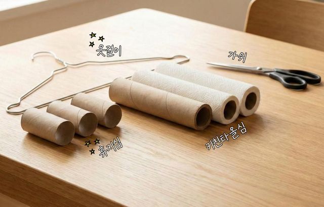 '휴지심-옷걸이' 꿀팁 실천을 위한 초간단 준비물들. 기사 내용 토대로 AI툴 활용해 제작한 자료사진.
