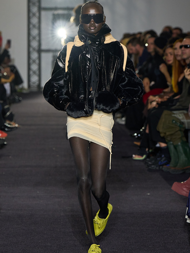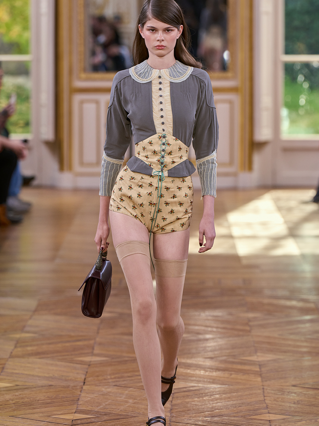 개인적으로 이번 시즌 가장 매혹적인 룩 중 하나. 정교한 레이스 칼라와 빈티지한 장미 패턴의 마이크로 쇼츠. 자칫 난해해 보일 수 있는 요소들이 모여 묘하게 서정적이면서도 반항적인 펑크 무드를 완성한다. 곳곳에 숨겨진 정교한 디테일을 발견하는 재미가 쏠쏠한데, 이는 브랜드 특유의 퇴폐적인 럭셔리함을 여실히 보여준다.