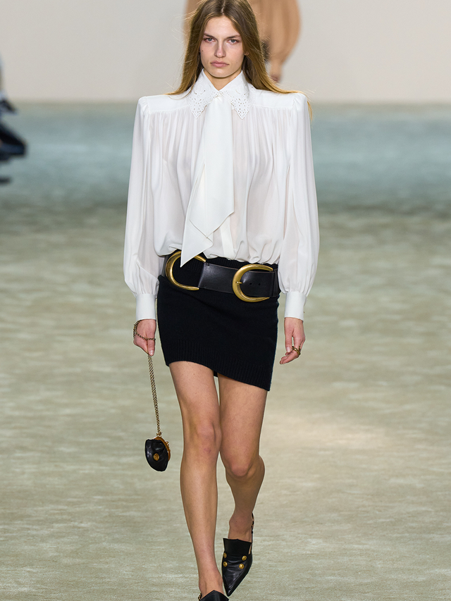 화이트 푸시 보(Pussy Bow) 블라우스에 로우라이즈 스커트, 그리고 시선을 압도하는 커다란 골드 버클 벨트까지. 70년대 보헤미안의 자유로운 분위기를 동시대적인 세련미로 치환해 런웨이의 정수를 그대로 담았음에도 당장 데일리 룩에 녹여내도 손색없을 아이템들의 조합이 돋보인다.