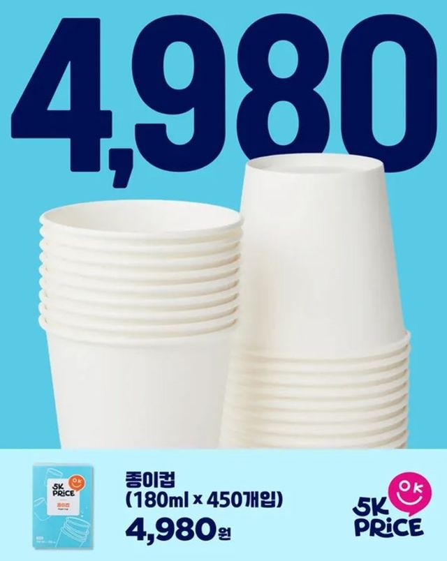 이마트는 해당 제품에 대해 "대용량 구성으로 실내 행사, 야외 활동에 모두 유용한 종이컵 450개에 4980원. 이마트의 상품 개발 노하우를 가득 담은 초저가 신규 브랜드 5K PRICE. 지금 바로 이마트, 이마트 에브리데이 매장에서 5천 원이면 충분한 초저가 장보기를 경험하세요"라고 설명했다.