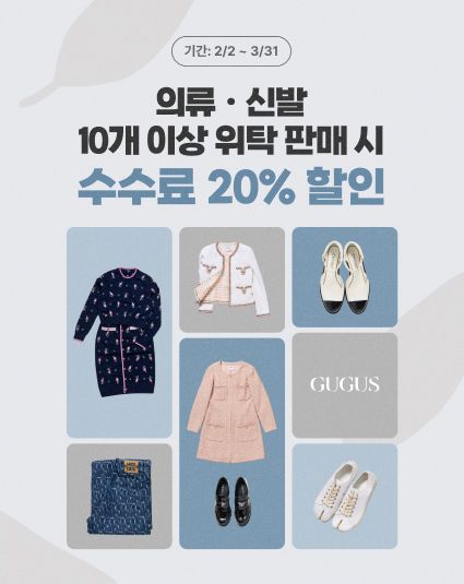 구구스는 고객들의 수수료 부담을 낮추고 보다 효율적인 판매를 돕기 위해 내달 31일까지 약 2개월간 ‘다량접수 이벤트를 운영한다. 이벤트 기간 동안 하이엔드 브랜드 의류 및 신발류를 10개 이상 위탁 접수할 경우 판매 수수료 20% 할인 혜택을 제공한다.