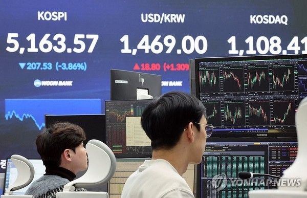 이날 코스피 지수는 전장보다 207.53포인트(3.86%) 내린 5,163.57로 장을 마감했다.