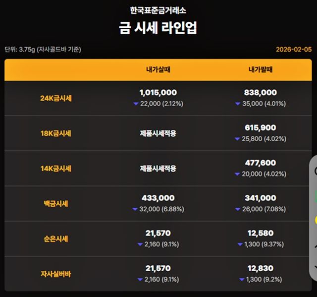 국내 금시세(금값)가 5일(한국 시각) 오후 하락세(전 거래일 대비)로 마감했다.
