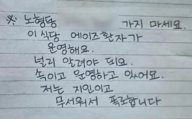 심지어 식당 사장은 쪽지 내용이 거짓임을 밝히기 위해 전 직원을 대상으로 에이즈 검사를 진행했고, 그 결과 모두 음성으로 확인됐다.